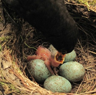 Das Amselweibchen macht immer wieder Gelegechecks und kontrolliert ihre Amseleier.