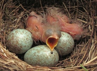 (Detail: Des Amselvaters Klauen drücken dem einen Amselbaby heftig auf die „Gurgel“.