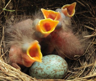 Bettelschnäbel-Quartett is nun komplett. Ein Amselküken reisst das erstaunliche große Gierschnäbelchen weiter auf als das andere. Leider orientieren sich die Amseleltern meiner Beobachtung nach an der größten „Trompete“ und füttern diese entsprechnd fleissig. Die schwächeren haben ganz schnell das Nachsehen. Ich mag das „survival of the fittest“ nicht!